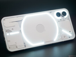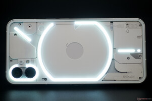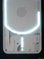 Mittels fünf Light-Strips und 900 Micro-LEDs kann das Glyph-Interface so einige Informationen anzeigen. Wer sich für längere Zeit mit dem Smartphone auseinandersetzt, kann Anrufern, Anrufergruppen und Apps verschiedene Leuchtsignale zuweisen. Beim Laden zeigt das Glyph Interface den Ladezustand an. Mit steigendem Akkustand steigt auch die Anzeige des Ladebalkens über dem USB-C-Port. Benutzt man die kabellose Reverse-Charging-Funktion des Nothing Phone (1) leuchtet der LED-Streifen um das Lade-Pad auf.