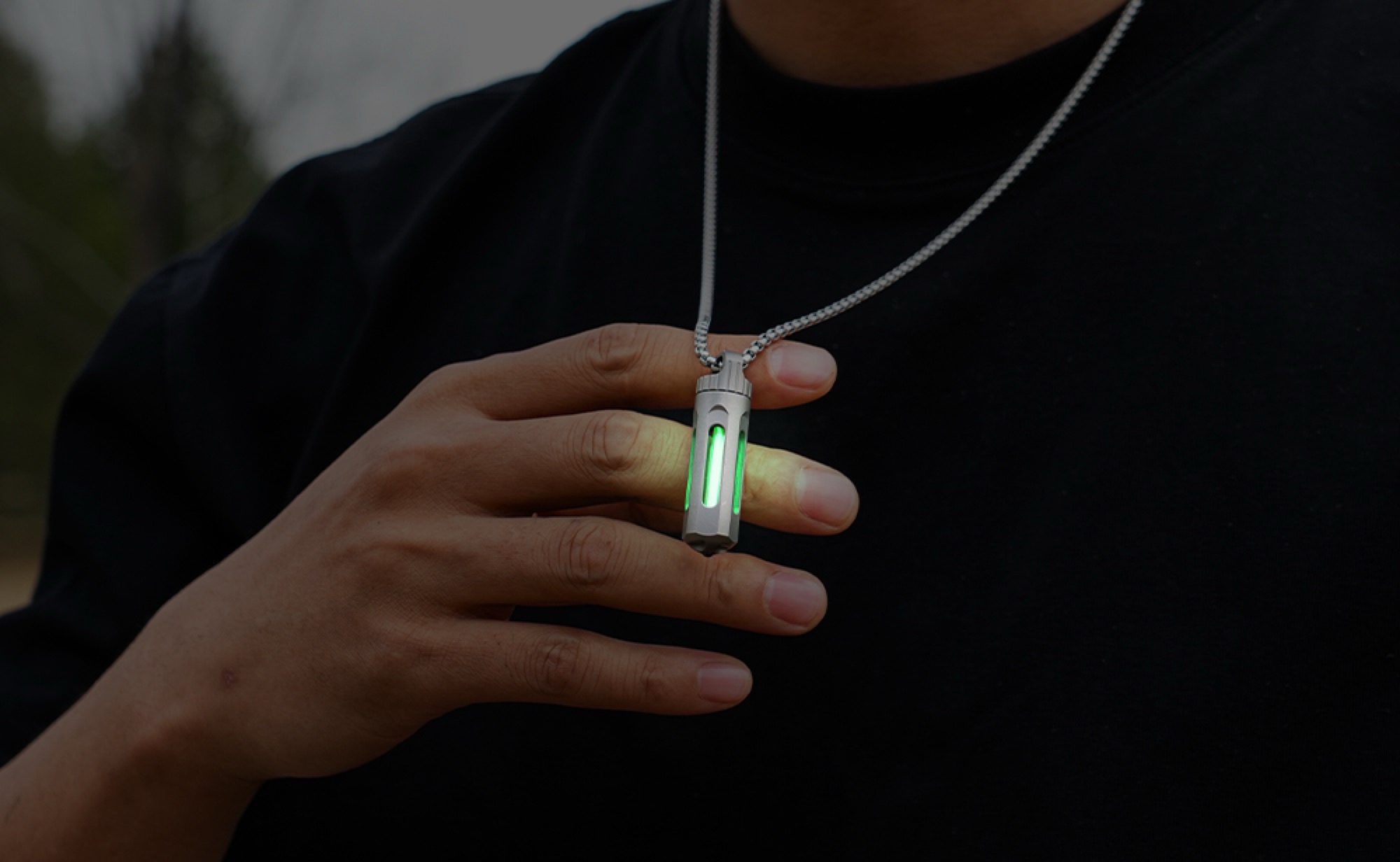 NoxTi ist auf den ersten Blick ein schlichter, 45 Millimeter langer und 10,8 Gramm schwerer Titan-Zylinder, der als Halskette oder auch an einem Schlüsselbund getragen werden kann. Aus einem pillenförmigen Sichtfenster strahlt sanftes Licht, das nicht auf Batterien angewiesen ist, das dafür aber nicht annähernd so hell leuchtet wie etwa eine Nitecore Tini 3 (ca. 45 Euro auf Amazon). Um das zu ermöglichen, setzt NoxTi auf phosphoreszierendes Tritium mit einer Halbwertszeit von 12,3 Jahren.