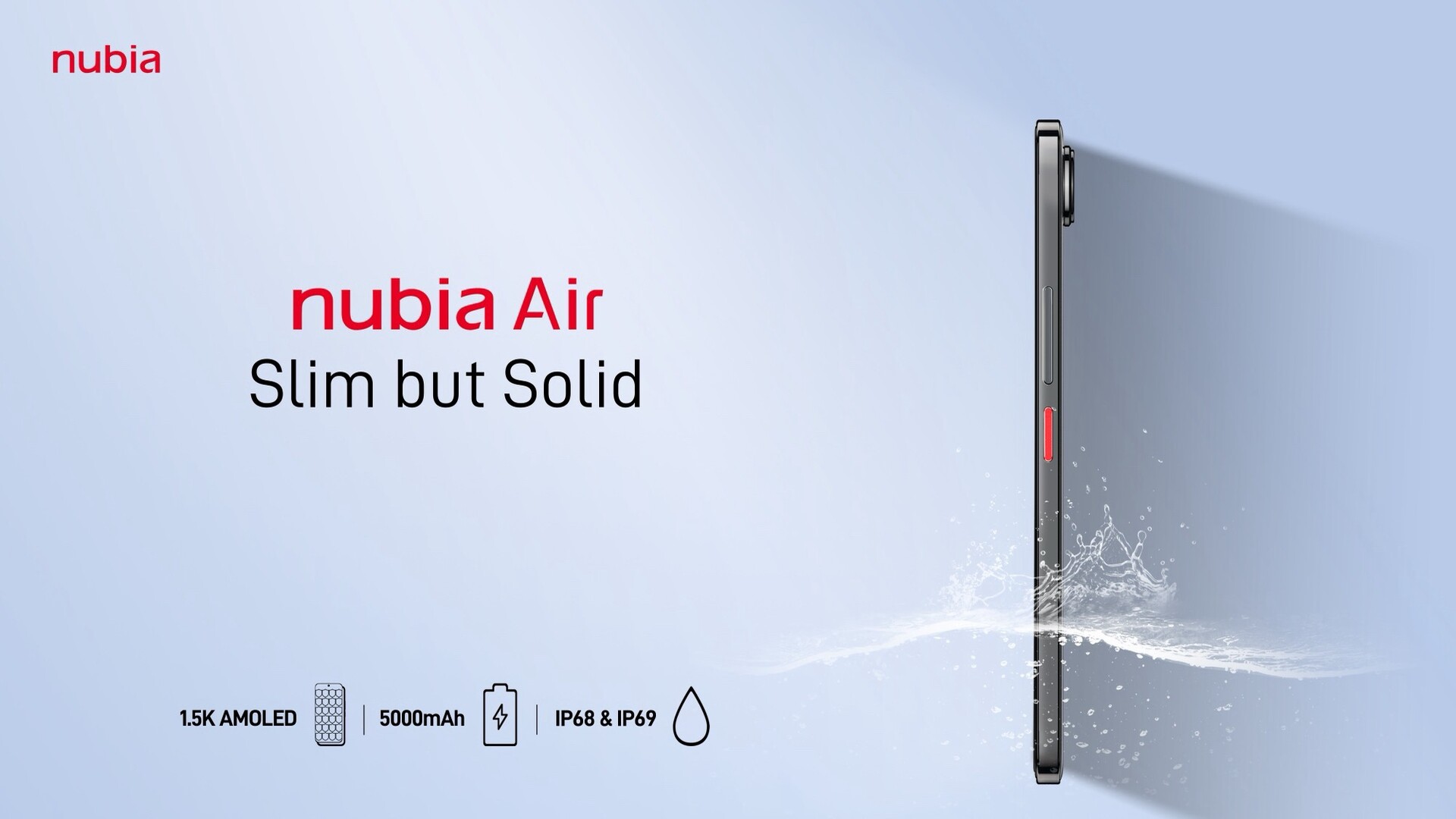 Dennoch ist das Nubia Air dünner als die meisten Mittelklasse-Smartphones am Markt. ZTE kann trotz eines Gewichts von nur 172 Gramm einen 5.000 mAh Akku mit 33 Watt Schnellladung verbauen. Das Gehäuse ist nach IP68 sowie nach IP69 zertifiziert und somit wasserfest. Das Display ist ein Highlight der Ausstattung, denn dieses basiert auf einem 6,78 Zoll AMOLED-Panel, das eine Auflösung von 2.720 x 1.224 Pixel, eine Bildfrequenz von 120 Hz und eine HDR-Spitzenhelligkeit von 4.500 Nits erreicht.