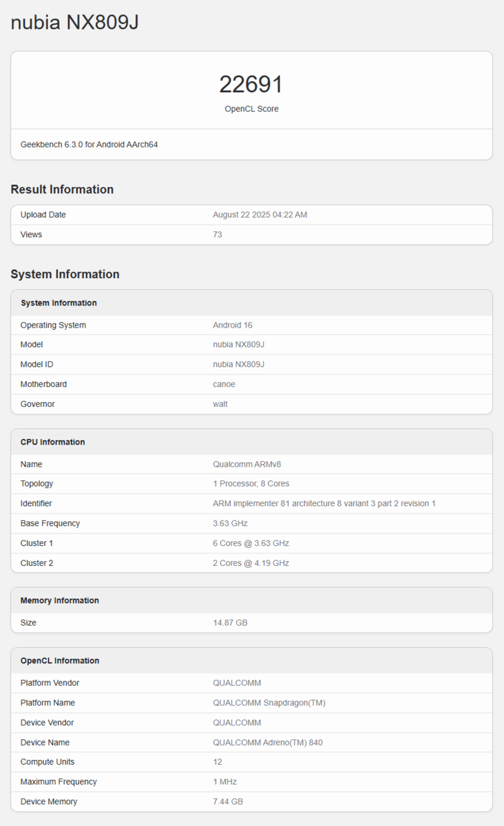 Auch einen GPU-Test hat dieses Nubia-Flaggschiff bereits absolviert und zwar den OpenCL-Test von Geekbench. Hier hat die Adreno 840 mit 22.691 Punkten einen um etwa 15 Prozent höheren Wert erziehlt als die Adreno 830 im RedMagic 10 Pro (etwa hier auf Geekbench). Das nächste Nubia-Gaming-Flaggschiff wird offenbar mit 16 GB RAM bestückt und läuft mit Android 16.
