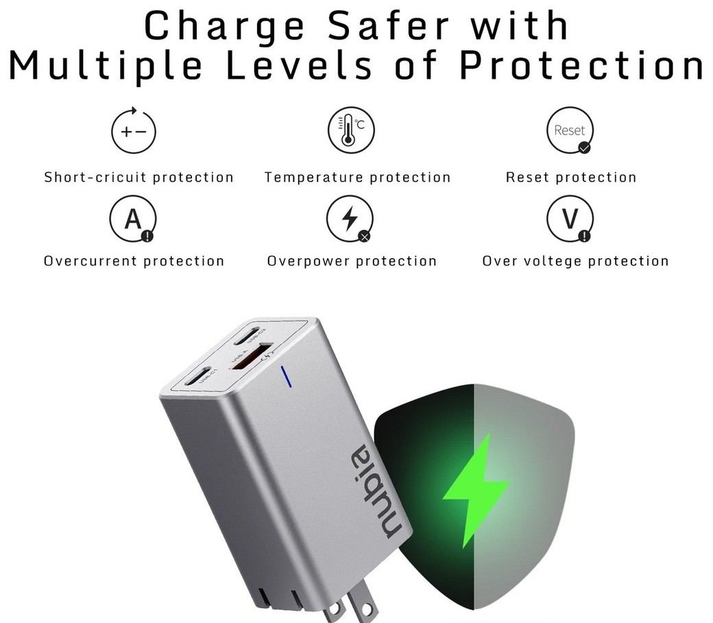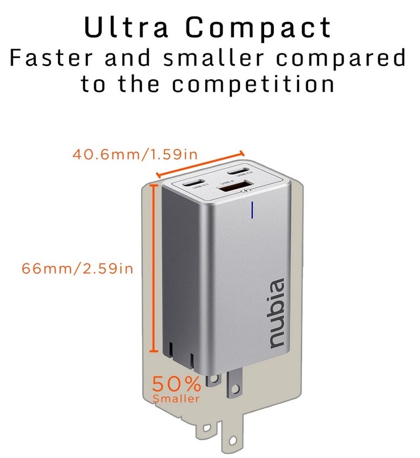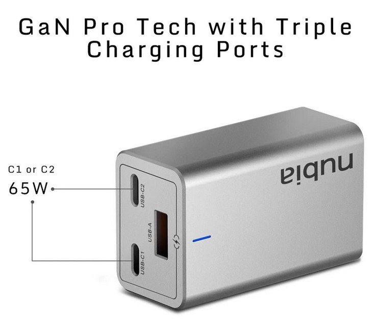Jüngster Zuwachs beim leistungsstarken Zubehör für die Gaming-Smartphones von Nubia ist der GaN Pro 65 Watt Triple-Port-Charger, den die Marke bereits in den USA online anbietet. Wie der Modellname des neuen Ladegeräts schon verrät, nutzt Nubia in seinem Schnellladegerät Galliumnitrid (GaN) für die Halbleiter. Wegen der geringeren Wärmeentwicklung lassen sich bei GaN-Ladern die Komponenten "dichter" zusammenpacken und trotz hoher Leistung auch sehr kompakt bauen. Hier lautet die Devise also "klein, aber leistungsstark".