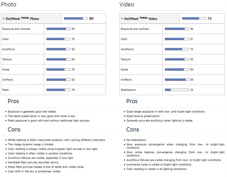 Im DxOMark Mobile Score erreichte das Nubia Z11 im Fotografie-Test lediglich 80 von maximal 100 Punkten und im Check der Videoqualitäten sogar nur 72 von 100. Das teure Google Pixel mit Sony IMX378 als amtierender Spitzenreiter des Mobile-Score-Rankings von DxO Mark holte hier beispielsweise eine Punktzahl von 89 respektive 88 Zählern. Bei den mit dem Nubia Z11 gemachten Fotos kritisierten die Tester vor allem den ungenauen Weißabgleich und den eingeschränkten Dynamikumfang sowie das Rauschverhalten. Im Videomodus stören vor allem die fehlende Bildstabilisierung und das langsame Ansprechverhalten bei Licht- und Farbtemperaturänderungen.