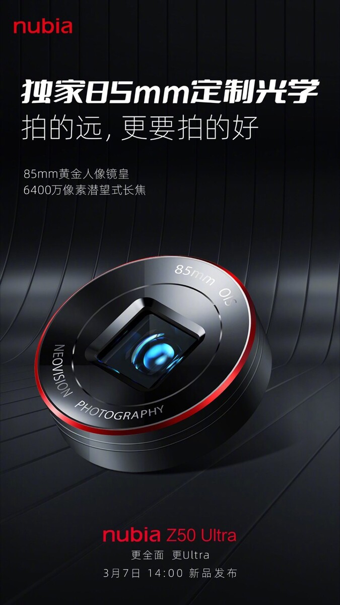 ZTE hat eine Reihe von Teaser-Bildern zum Nubia Z50 Ultra veröffentlicht, die bestätigen, dass das Smartphone am Dienstag, dem 7. März, offiziell vorgestellt wird. Wie eines der Bilder bereits zeigt, setzt das Smartphone auf ein flaches Display, unter dem sich eine 16 MP f/2.0 Selfie-Kamera verbirgt.
