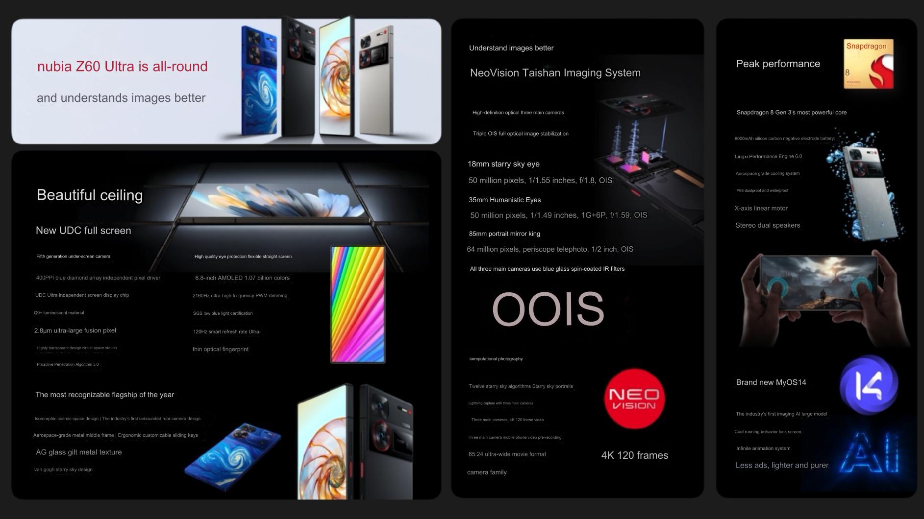 Nubia verspricht hohe Gaming-Performance und niedrige Temperaturen dank einer effizienten Vapor-Chamber-Kühlung des Snapdragon 8 Gen 3. Gemeinsam mit einem 6.000 mAh Akku und 80 Watt Fast-Charging sollen extrem lange Akkulaufzeiten möglich sein, Stereolautsprecher und ein auf Android 14 basierendes MyOS 14 vervollständigen das ungewöhnliche Kamera-Flaggschiff, das in China in fünf Konfigurationen zwischen 12 GB RAM und 24 GB RAM sowie 256 GB Speicher bis 1 TB Speicher erhältlich sein wird. Leider wurde bisher nichts Neues in punkto Software-Updates versprochen, traditionell eher ein Nachteil der Nubia-Flaggschiffe. Die Preise starten bei aktuell 3.999 Yuan (513 Euro) und enden bei 5999 Yuan (770 Euro), auch in Europa soll das Nubia Z60 Ultra aber in Kürze erhältlich sein.