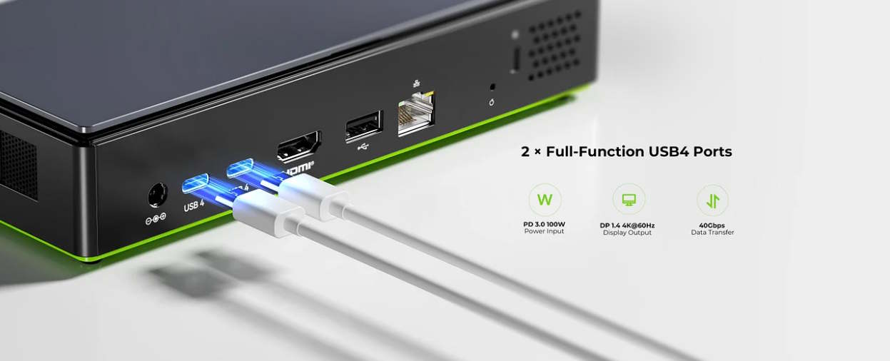 Der PC misst nur 186 × 88 × 36,6 Millimeter und soll trotzdem eine ordentliche Leistungsfähigkeit bieten. So kommt der Intel Core Ultra 7 256V zum Einsatz, welcher insgesamt acht Rechenkerne und auch eine NPU mitbringt. Eine externe Grafikkarte lässt sich im Prinzip nutzen, dann allerdings nur über USB 4 und mit entsprechend verringerter Datenübertragungsrate. USB 4 steht dabei zweimal bereit, wobei die Versorgung mit elektrischer Energie ebenfalls über USB 4 erfolgen kann. Selbiges gilt für die Ausgabe von Bildinhalten. HDMI ist vorhanden, wobei sowohl über den einzelnen HDMI 2.1-Ausgang als auch die beiden USB 4-Anschlüsse Bildinhalte mit 4K-Auflösung und 60 Hz ausgegeben werden können.