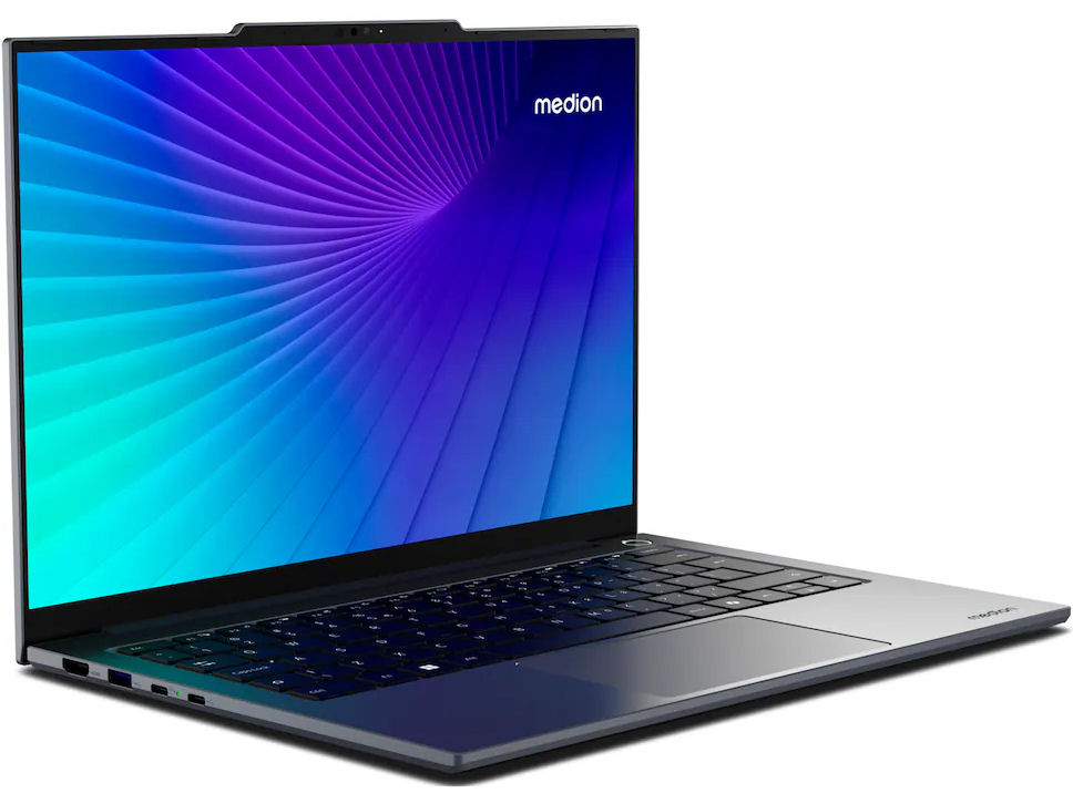 Medion hat den Rechner mit einem 14-Zoll-Bildschirm im arbeitsfreundlichen 16:10-Format bestückt, der über eine native Auflösung von 2.880 x 1.800 Bildpunkten verfügt. OLED-typisch liefert das Panel einen hervorragenden Kontrast bzw. Schwarzwert und kurze Reaktionszeiten. Weiterhin sprechen eine hohe Bildwiederholfrequenz von 120 Hz und die Abdeckung des sRGB-Farbraums für das Display. Das einzige Manko findet sich in der reflektierenden Panel-Oberfläche.