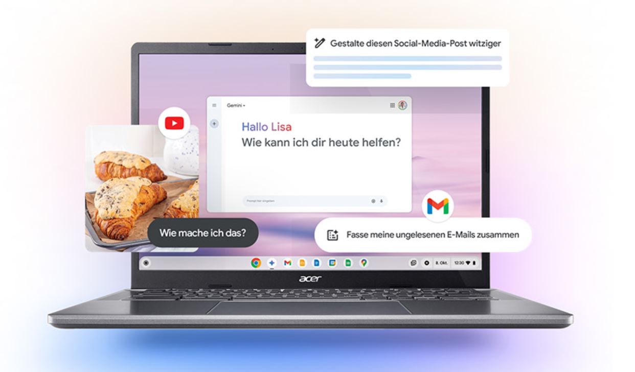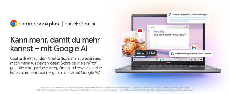 Dazu sind die Geräte mit Gemini, der KI von Google, bestückt, um den Alltag einfacher zu machen. Käufer erhalten zum Chromebook Plus zudem 12 Monate das Google One AI Premium-Abo mit Zugang zu Gemini Advanced, 2 TB Cloud-Speicher und Gemini in Google-Apps wie Gmail, Docs und mehr kostenlos dazu.