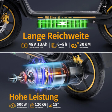Der angebotene Twofish M5 Elite weist eine EEC-Zertifizierung auf und darf somit unter Berücksichtigung der entsprechenden Vorgaben in EU-Ländern sowie in der Schweiz am öffentlichen Straßenverkehr teilnehmen. Angetrieben wird der Roller von einem 500 W starken Motor, der im Zusammenspiel mit der 624 Wh großen Batterie eine Reichweite von bis zu 30 km ermöglicht.