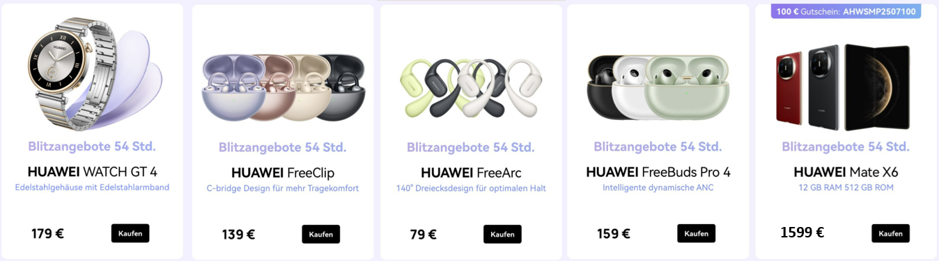 Klassische In-Ear-Ohrhörer sind hingegen die HUAWEI FreeBuds Pro 4, die Spitzenklang, dynamisches ANC und kopfbewegungsbasierte Steuerung für derzeit nur 146,28 Euro bieten. Ebenfalls Teil des Wochenend-Sales ist das stylische Foldable HUAWEI Mate X6. Das mit 9,9 mm schlanke Falt-Smartphone mit riesigem Innendisplay und ultralanger Akkulaufzeit ist dank eines auf der Produktseite eingebundenen Gutscheincodes für nur 1.499 Euro bestellbar.