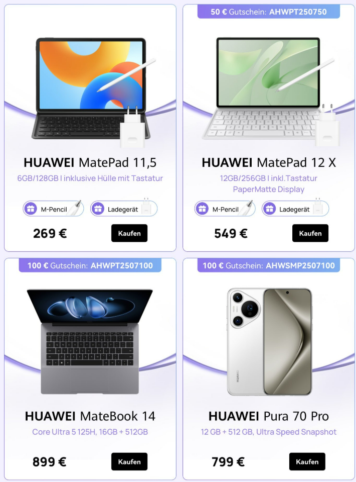 Neben dem Flash Sale an diesem Wochenende offeriert HUAWEI noch viele weitere Angebote. Beispielsweise lassen sich die Tablets HUAWEI MatePad 11.5 samt M-Pencil und Ladegerät für nur 269 Euro und MatePad 12 X mit gleichem Zubehör für nur 499 Euro (einschl. 50 Euro Rabattcode) ordern.