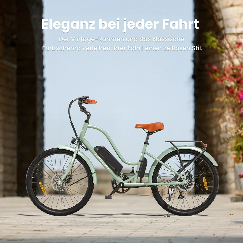 Das Touroll B2 ist ein modernes und komfortables Elektrofahrrad, das sich allerdings im Retro-Stil präsentiert. Der wunderschön gefertigte Durchstiegsrahmen ermöglicht nicht nur ein bequemes Auf- und Absteigen, sondern auch eine komfortable Sitzposition. Dazu kommt das elegante Design in Mintgrün samt Highlights wie Sattel und Griffen in Hellbraun.