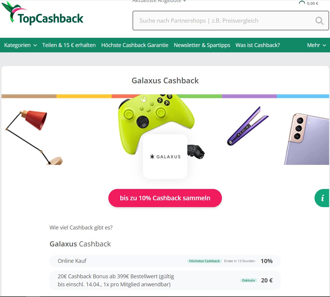 Nur heute, den 13.04.2024, gilt die Aktion von TopCashback mit 10 % Rabatt + 20-Euro-Gutschein für den Händler Galaxus. Um entsprechenden Cashback ausbezahlt zu bekommen, müssen die Anweisungen von TopCashback genaustens befolgt werden. Die Auszahlung erfolgt dann innerhalb von zwei bis drei Monaten.