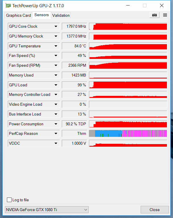 Die Nvidia Geforce GTX 1080 Ti taktet standardmäßig etwas höher als die Nvidia Titan X. GPU-Z gibt die Taktraten mit 1.481 MHz (Default) und 1.582 MHz (Boost) an. Beim GPU-Z-Render-Test haben wir eine maximale GPU-Taktfrequenz von 1.898 MHz ermittelt (Titan X 1.835 MHz). In The Witcher 3 taktet unser Testmuster mit 1.760 - 1.800 MHz. Das “Temperature Target“ der 1080 Ti liegt im Auslieferungszustand bei 84 °C. Wird diese Temperatur überschritten, so beginnt die GPU ihre Leistung zu drosseln.