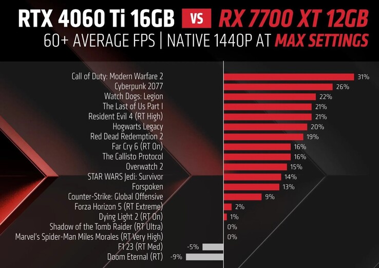 So bietet Notebooksbilliger eine Asus Dual GeForce RTX 4060 Ti Advanced mit 16 GB VRAM für nur 469 Euro an, eine MSI GeForce RTX 4060 Ti Gaming X ist im Preisvergleich schon ab 485 Euro zu finden. Das Timing der Preissenkung spricht dafür, dass es sich dabei um eine Reaktion auf die AMD Radeon RX 7700 XT handelt, die Ende August offiziell vorgestellt wurde. Laut AMDs Marketing ist die Radeon RX 7700 XT bei 1.440p-Auflösung in vielen Spielen schneller als die GeForce RTX 4060 Ti, allerdings gilt dies selbst in offiziellen Benchmarks nur, solange weder DLSS noch Raytracing genutzt werden.