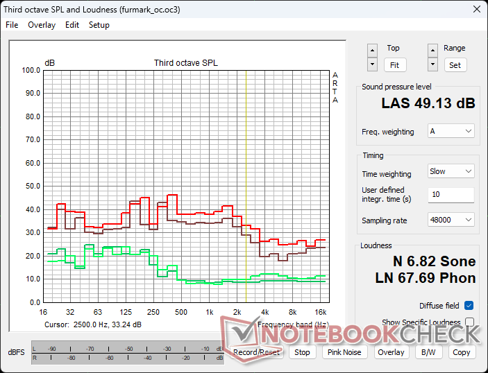 Bei 100% Power regt der FurMark-Stress die Lüfter zu einer Geschwindigkeit von 53% an, was in einer Lautstärke von 44,42 dB(A) resultiert. Bei übertakteten 133% Power drehen die Lüfter bei 65%, die Lautstärke steigt auf höhere 49,13 dB(A) Sound Pressure Level (SPL).