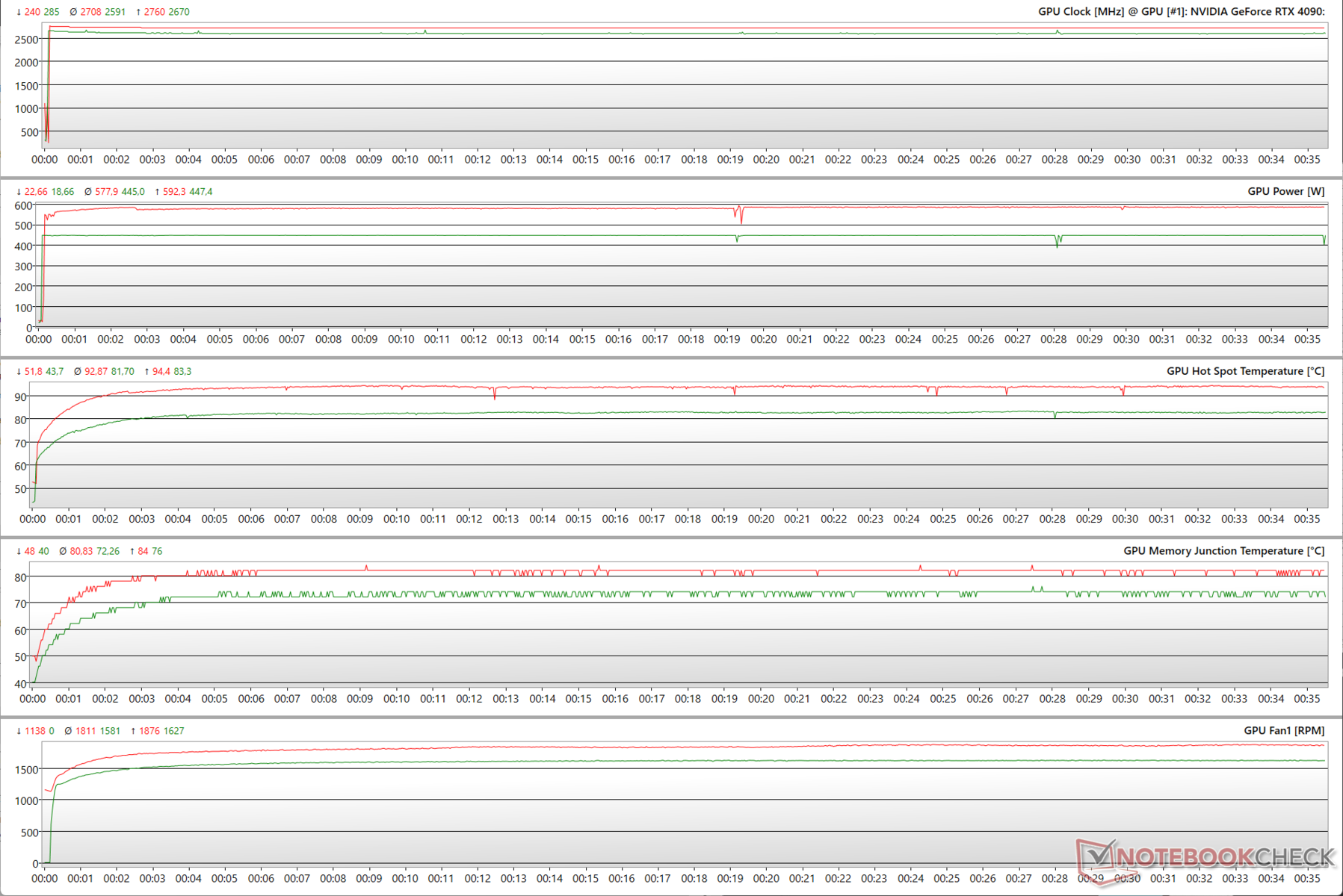 Die Lüfter erreichen beim höheren PT mit 1.876 RPM ein Maximum von 65% der gerateten RPM, normalerweise drehen sie aber recht konstant bei 1.581 RPM unter den Standardeinstellungen. In den gleichen Settings beträgt der Hot Spot annähernd 82 °C, das kann beim Übertakten auf an die 93 °C anwachsen.