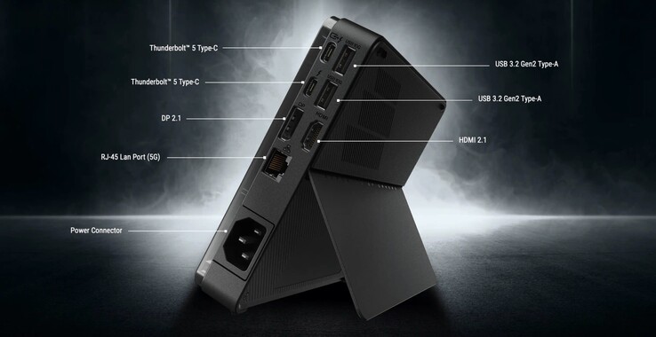 Das 330 Watt Netzteil erlaubt es der eGPU, ein angeschlossenes Notebook mit bis zu 140 Watt aufzuladen. Ein zweiter Thunderbolt 5-Anschluss ermöglicht es, einen Monitor oder ein weiteres Thunderbolt-Gerät anzuschließen. Durch zwei USB-A-Ports, 2,5 Gbit/s Ethernet, SD-Kartenleser, DisplayPort 2.1 und HDMI 2.1 fungiert die ROG XG Mobile zeitgleich als Docking-Station. Das Gehäuse besitzt eine dezente RGB-Beleuchtung, die in Asus Armoury Crate konfiguriert werden kann.