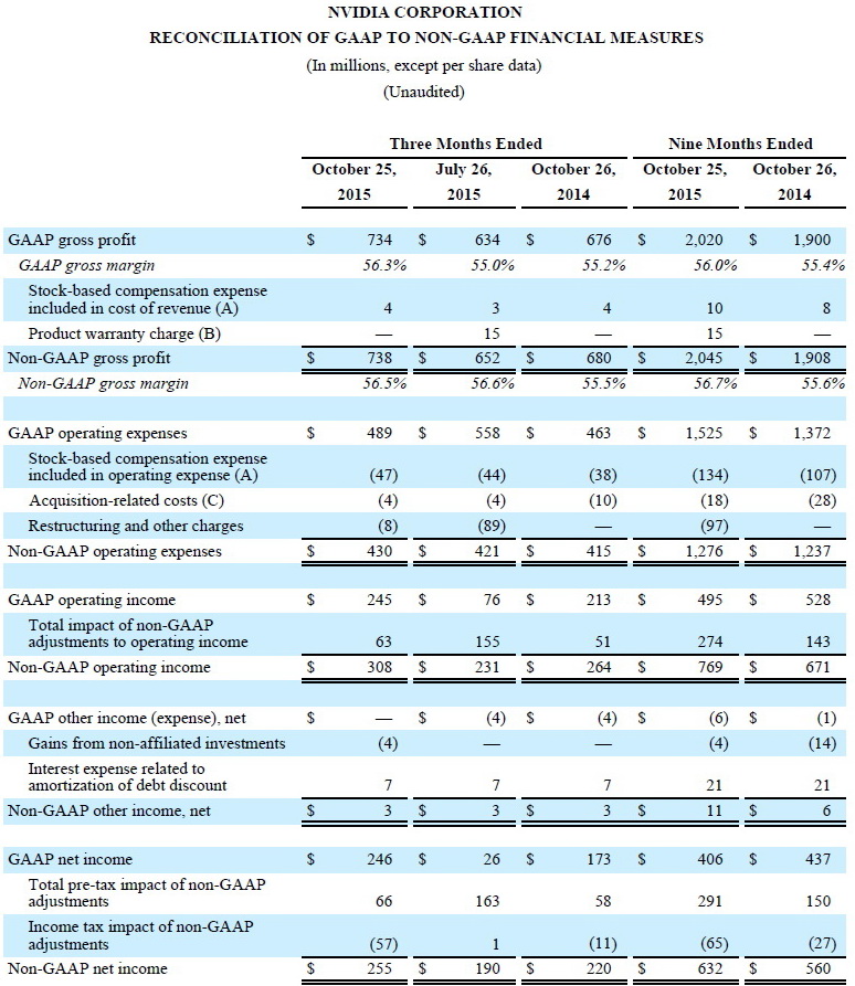 Für das 3. Geschäftsquartal 2016 weist Nvidia einen operativen Gewinn von 245 Millionen US-Dollar aus (Q3/FY2015: 209 Mio.), was einer Zunahme um 17,2 Prozent entspricht. Der Nettogewinn stieg bereinigt um 42,2 Prozent, von 173 auf 246 Mio. Dollar. Im Y-o-Y-Vergleich (9 Monate) sank der operative Gewinn von Nvidia allerdings um 6,7 Prozent, von 528 auf 495 Mio. US-Dollar. Auch der Nettogewinn fiel mit 406 Mio. Dollar (minus 7,1 Prozent), im Vergleich zu den 437 Mio. aus dem Vorjahr, etwas geringer aus.