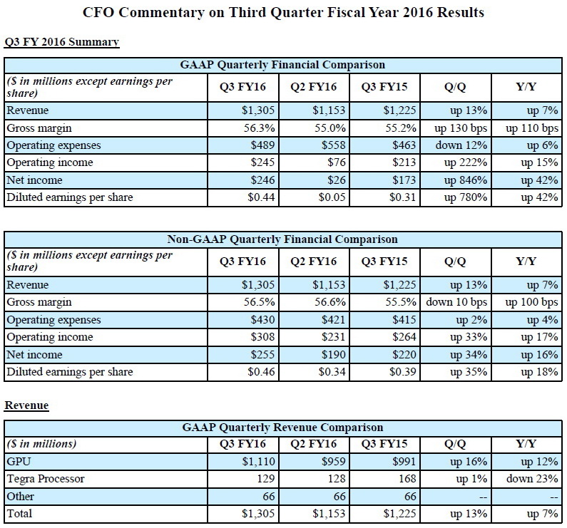Nvidia meldete für seine Geschäftszahlen in Q3/FY2016, das zum 25. Oktober 2015 endete, einen Rekordquartalsumsatz in Höhe von 1,305 Milliarden US-Dollar. Im Vergleichsquartal des Vorjahres erzielte Nvidia noch 1,225 Mrd. Dollar. Das entspricht einem Plus von 6,5 Prozent. Auch im Jahresvergleich (9-Monatszeitraum) legte Nvidia beim Umsatz kräftig um 5,2 Prozent, von 3,431 auf 3,609 Mrd. US-Dollar zu.