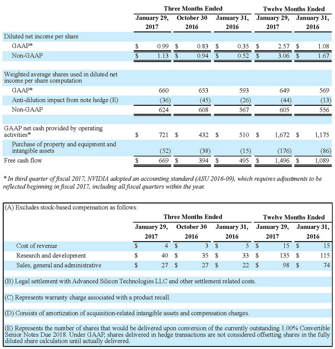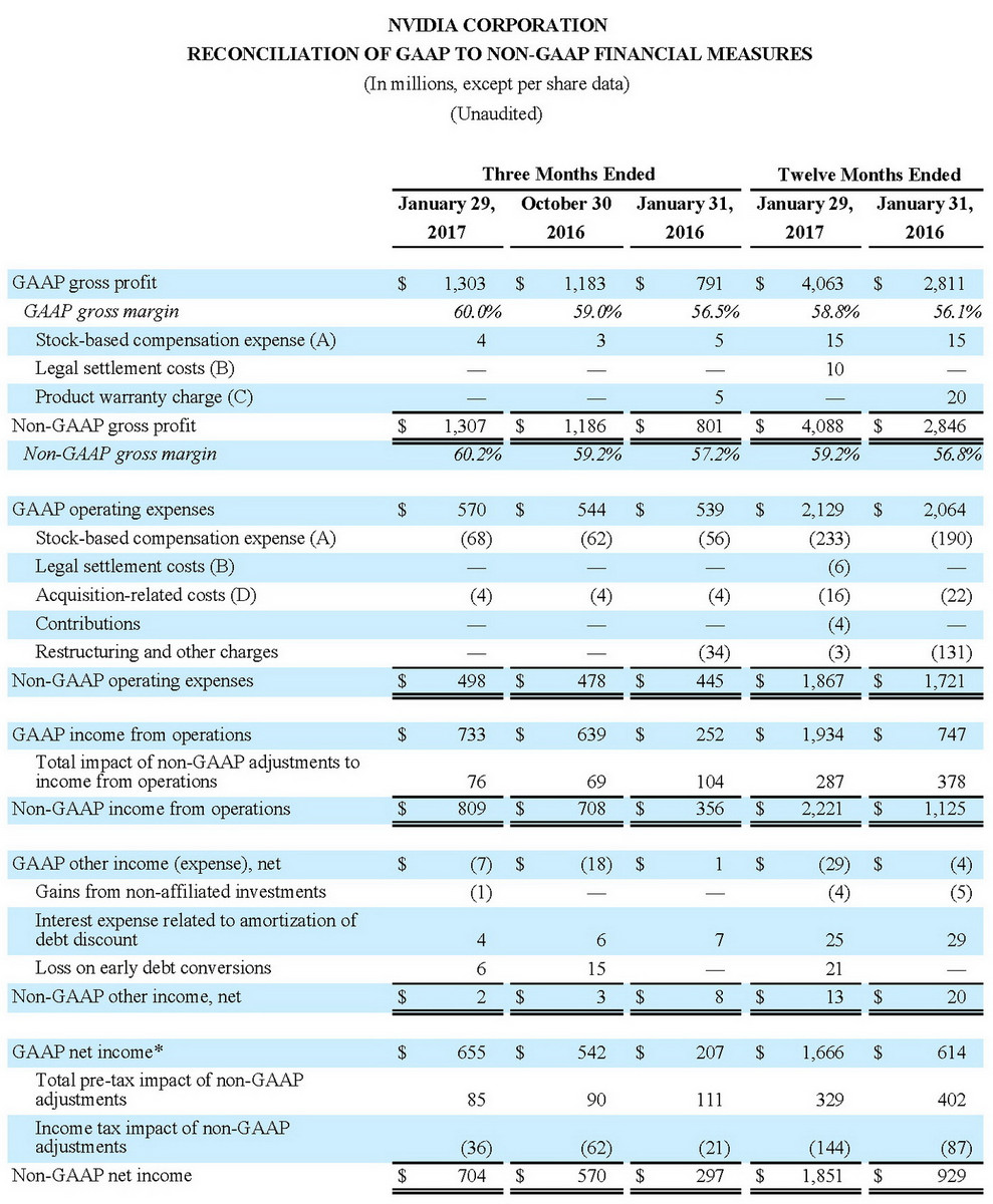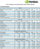 So stieg der Umsatz von Nvidia in Q4/FY2017 von 1,40 Mrd. im 4. Quartal 2016, auf jetzt 2,17 Milliarden US-Dollar (plus 55 Prozent). Beim Nettogewinn von Nvidia gab es geradezu eine Explosion im Vergleich zum Vorjahresquartal: 655 Millionen US-Dollar Reingewinn (plus 216 Prozent). In Q4/FY16 hatte Nvidia noch einen Nettogewinn von 207 Millionen Dollar ausgewiesen.