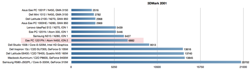 Hier erreichte das Asus 1201PN 6882 Punkte. Damit kann das Gerät fast alle Notebooks mit Intel GMA950, X3100 und 4500M (HD) hinter sich lassen. Lediglich vereinzelte Geräte mit besonders leistungsstarken CPUs können diesen Score übertreffen. Netbooks auf Pinetrail Basis (GMA3150) oder ältere Atom N270/280/GMA950 Kombinationen erreichen nur rund 2500-3000 Punkte.