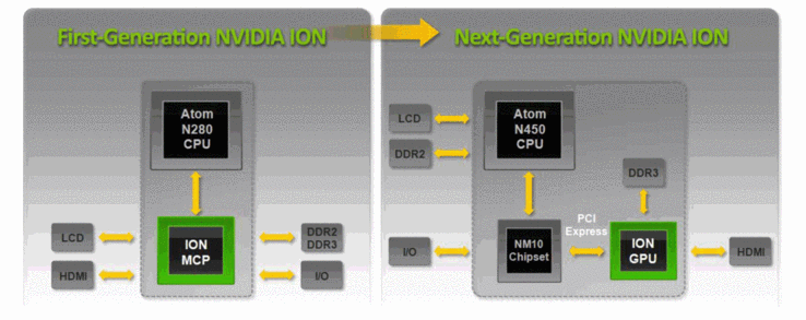 Bereits die erste Ausgabe von Ion sollte Netbooks auf ein höheres Performance-Niveau heben und damit auch ihre Einsatzmöglichkeiten entsprechend erweitern. Für die neuen Atom Prozessoren konnte NVIDIA jedoch nicht weiterhin einen Chipsatz anbieten und deshalb kommt nun die nächste Generation der ION-Plattform mit dedizierter Grafikkarte.