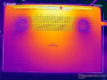 An der Ober- und Unterseite des Gehäuses können bei gleichzeitigem Betrieb von Prime95 und FurMark Temperaturen von über 40 °C erreicht werden. Diese Bereiche befinden sich in der Nähe der Rückseite des Geräts, sodass die Handballenablagen aus Kohlefaser immer noch angenehm kühl bleiben, aber der Großteil der Metallunterseite wird sehr warm.