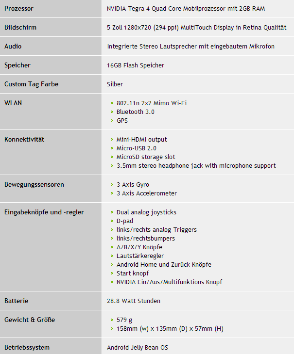 Dem Tegra 4 sind 2 GB Arbeitsspeicher zur Seite gestellt. Als interner Speicher werden 16 GB geboten. Mit Dualband-Wi-Fi, einem micro-SD-Kartenanschluss und einem micro-HDMI-Ausgang ist das Shield gut gerüstet. Bluetooth 3.0 ist allerdings nicht mehr der jüngste Standard. Ein Akku mit 28,8 Wattstunden soll für eine lange Laufzeit sorgen.