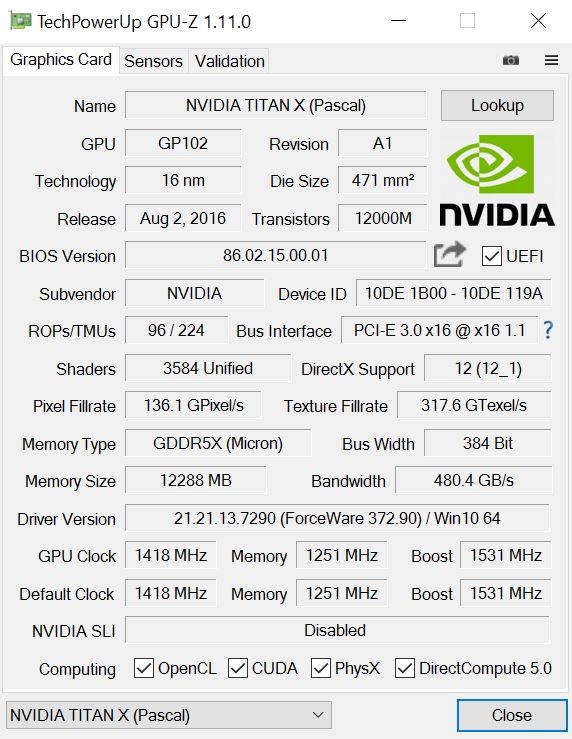 | NVIDIA Titan X Pascal Nvidia Titan X (Pascal), Intel Xeon E5-2680 v4 | NVIDIA Titan X Pascal NVIDIA Titan X Pascal, AMD Ryzen Threadripper 1950X | NVIDIA GeForce GTX 1080 (Desktop) Nvidia GeForce GTX 1080 Founders Edition, Intel Core i7-4790K | NVIDIA GeForce GTX 980 SLI (Laptop) MSI GT80S 6QF, Intel Core i7-6820HK | NVIDIA GeForce GTX 980 (Laptop) Schenker XMG U716, Intel Core i7-6700 | NVIDIA GeForce GTX 980 (Laptop) MSI GT72S 6QF, Intel Core i7-6820HK | NVIDIA Quadro M5000M MSI WT72-6QM, Intel Xeon E3-1505M v5 | NVIDIA Quadro M3000M Schenker W706, Intel Core i7-6700 | |