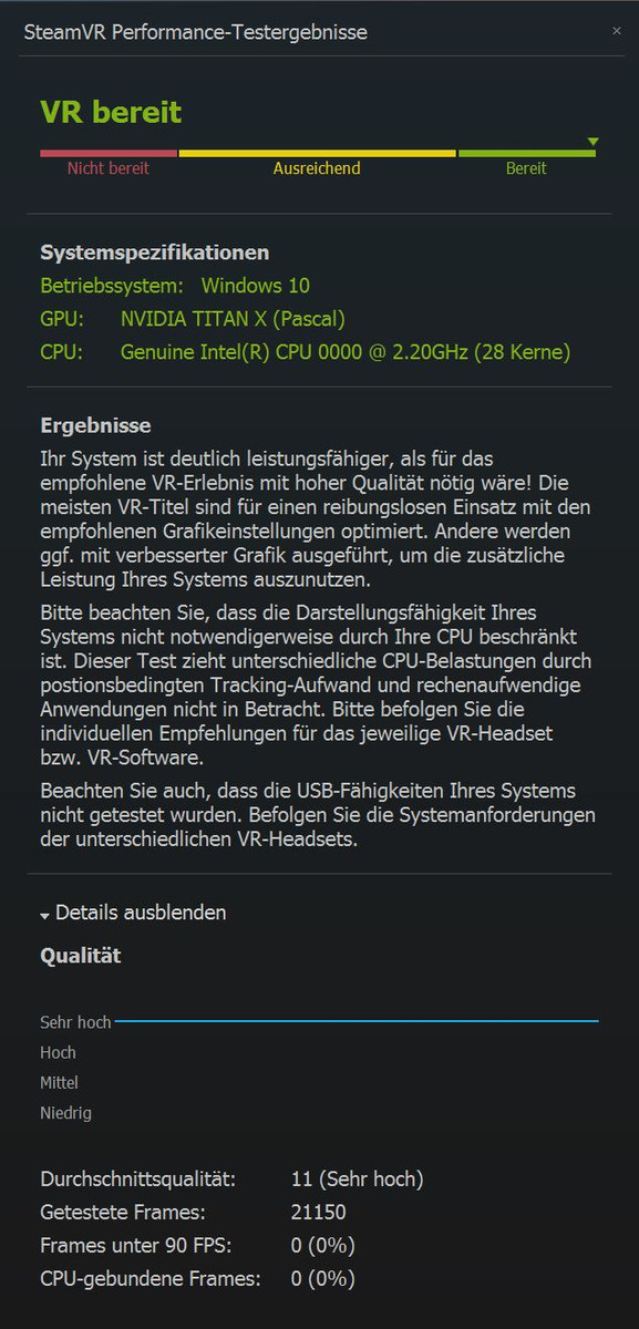 | min. | mittel | hoch | max. | QHD | 4K | < 30 fps < 60 fps < 120 fps ≥ 120 fps | 1 6 54 137 | 1 9 80 109 | 2 18 96 86 | 2 22 108 55 | 7 50 60 11 | 41 92 50 14 |