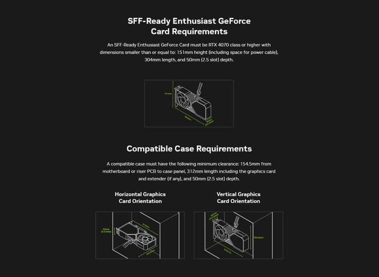 Kompatible SFF-Gehäuse müssen vom Mainboard bis zum Seiten-Panel mindestens 15,45 Zentimeter und in der Länge mindestens 31,2 Zentimeter Platz bieten, sodass Grafikkarten zumindest ein wenig Abstand zu anderen Komponenten haben. Grafikkarten dürfen nach Nvidias SFF-Richtlinien sowohl vertikal als auch horizontal im Gehäuse platziert werden.