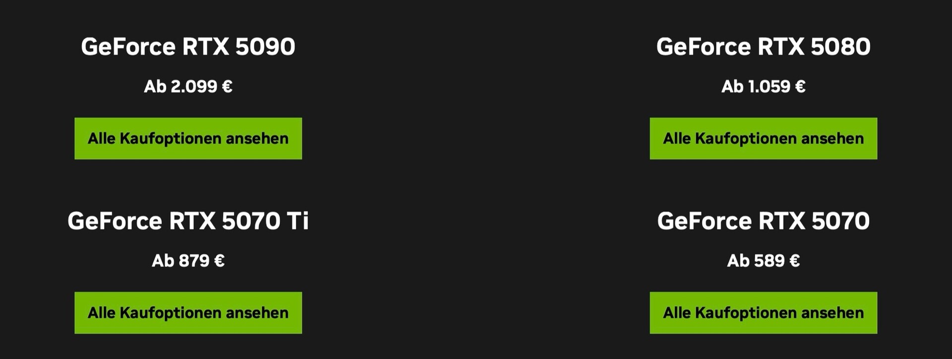 Da die GeForce RTX 5050, die GeForce RTX 5060-Serie und die GeForce RTX 5070 Ti nicht als Founders Edition angeboten werden, bleiben die UVPs dieser Modelle unverändert. Zumindest die GeForce RTX 5090 Founders Edition wird nach dieser Preissenkung tatsächlich günstiger, denn die GPU ist im Preisvergleich nicht unter 2.299 Euro zu finden. Die GeForce RTX 5080 ist schon ab 1.028 Euro zu bekommen, die GeForce RTX 5070 ab 530 Euro.