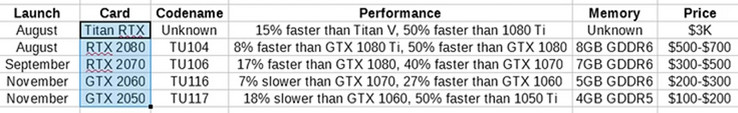 Zusätzlich gibt es Leistungsangaben. Demzufolge ist eine RTX 2080 angeblich 8 % schneller als eine GTX 1080 Ti oder 50 % schneller als eine normale GTX 1080. Die GTX 2070 soll noch immer 17 % schneller sein als eine GTX 1080. Zudem soll es eine Titan RTX geben, welche 50 % schneller sein soll als eine GTX 1080 Ti.