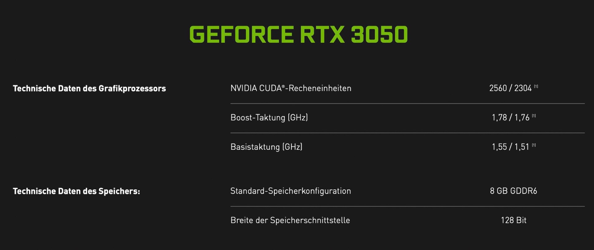 Die offizielle Produktseite der Nvidia GeForce RTX 3050 (ca. 360 Euro auf Amazon) listet nun zwei unterschiedliche Varianten der Grafikkarte. Neben der ursprünglichen Version mit 2.560 CUDA-Recheneinheiten und Boost-Taktfrequenzen bis 1,78 GHz wird auch eine Variante mit 2.304 CUDA-Kernen bei 1,76 GHz gelistet.