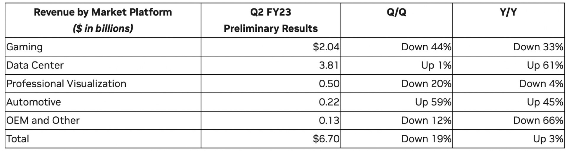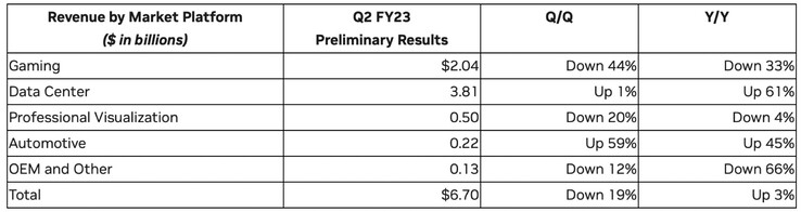 Wie die unten eingebettete Tabelle zeigt, konnte der Konzern im Gaming-Sektor nur 2,04 Milliarden US-Dollar Umsatz erzielen, 33 Prozent weniger als zum selben Zeitraum im Vorjahr, und 44 Prozent weniger als im ersten Quartal des laufenden Geschäftsjahres. Nvidia begründet diesen Rückgang vor allem mit makroökonomischen Faktoren, womit der Konzern auf Variablen wie die derzeit sehr hohe Inflation und Währungskursschwankungen anspielen dürfte.