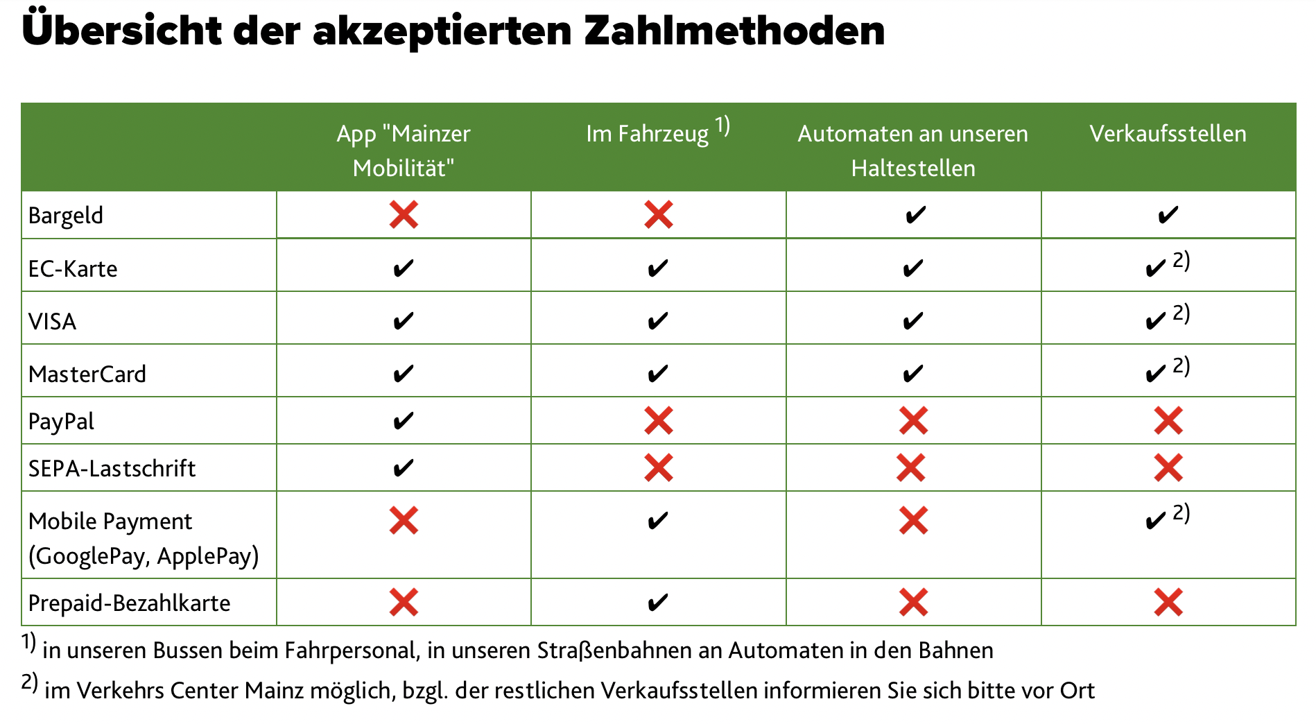 Im Zuge der Einführung der Prepaid-Karte wurde auch die Bargeldzahlung teilweise in Mainz abgeschafft, so die Pressemitteilung. Laut dem Unternehmen wurde die Bargeldzahlung bereits zum 1. Juni in Bussen und Straßenbahnen abgeschafft. Die Mainzer Verkehrsbetriebe widersprechen sich aber beim Bus. "In unseren Bussen können Sie seit dem 10. Januar beide Zahlarten nutzen, bar und unbar." heißt es in der aktuellen FAQ.