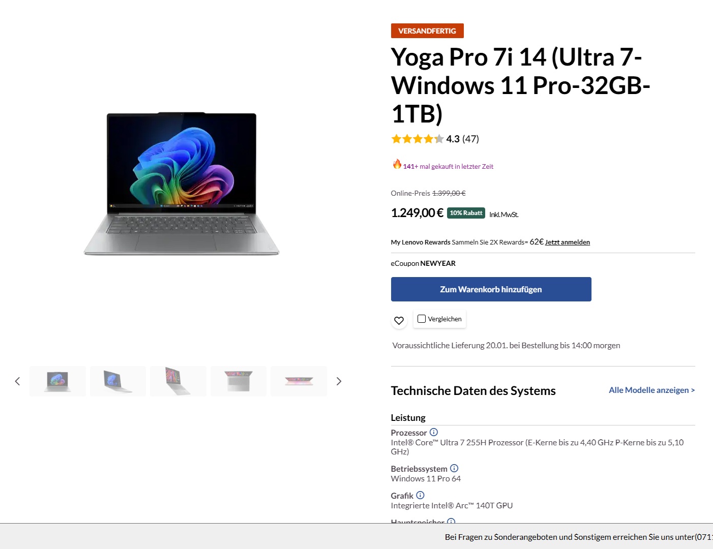 Die Yoga-Pro-7-Reihe von Lenovo steht für potente, gut ausgestattete Notebooks, die mit hervorragenden Bildschirmen aufwarten können. Aktuell führt der Lenovo Store mit dem Yoga Pro 7 14IAH10 83KF002PGE ein Intel-basiertes 14.5-Zoll-Modell zu einem Angebotspreis von 1.249 Euro im Sortiment. Ein Schwestermodell erlangte in unserem Test die Bewertung "Gut (87 %)".
