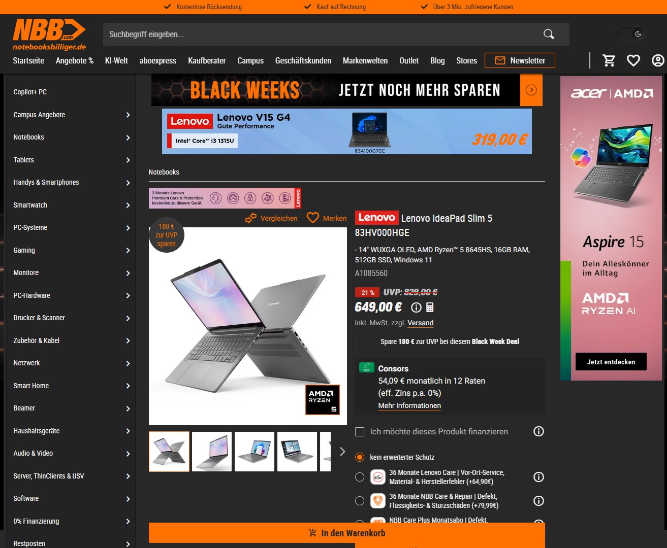 Innerhalb der IdeaPad-Slim-5-14AHP10-Reihe hält Lenovo potente Office-Notebooks bereit, deren Technik in schicken Aluminium-Gehäusen steckt. Aktuell führt Notebooksbilliger.de einen Vertreter der Serie zu einem Angebotspreis von 649 Euro im Sortiment. Es lag uns bisher noch kein Abkömmling der Reihe für einen Test vor.