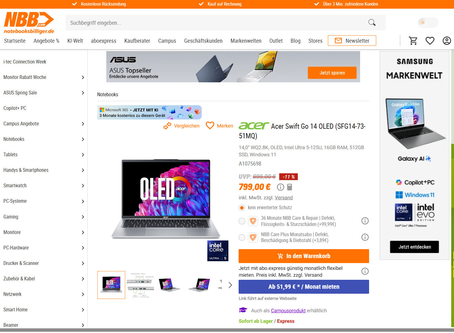 Wer es eine Nummer kleiner wünscht, findet bei Notebooksbilliger.de mit dem Swift Go 14 SFG14-73-51MQ ein 14-Zoll-Pendant zum Swift Go 16. Ausstattungsunterschiede finden sich lediglich beim Bildschirm: Das 14-Zoll-Panel verfügt über eine Auflösung von „nur“ 2.800 x 1.800 Pixel und bietet eine Bildwiederholfrequenz von 90 Hz. Der Kaufpreis liegt aktuell ebenfalls bei 799 Euro.