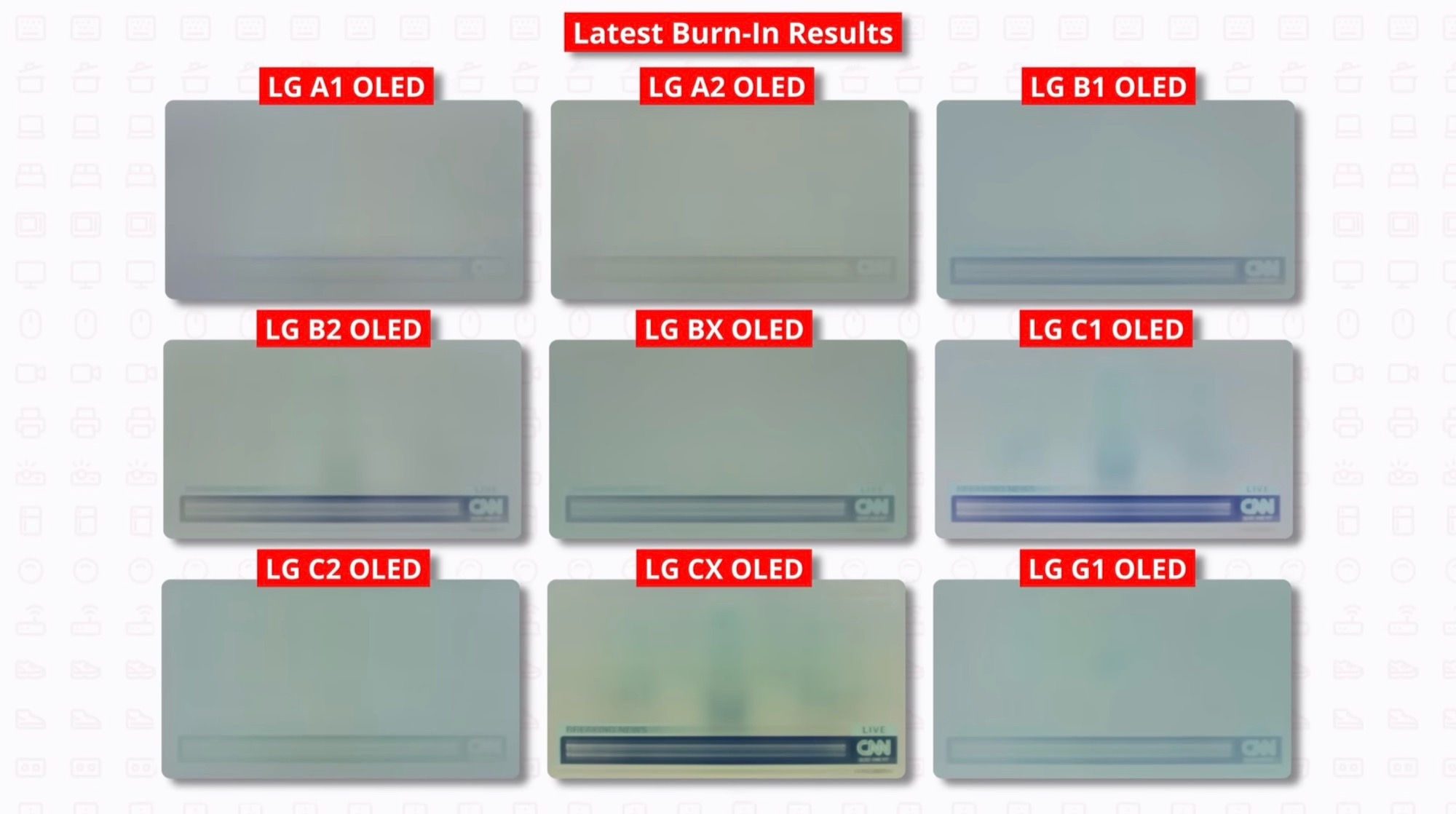 Die meisten Probleme wurden bei Fernsehern mit einer LED-Hintergrundbeleuchtung ohne Local Dimming festgestellt – fast 60 Prozent der getesteten Modelle hatten mit Defekten zu kämpfen, in vielen Fällen sind eine oder mehrere LEDs durchgebrannt. Derartige Ausfälle sind bei OLED-Fernsehern ausgesprochen selten. Wie dieser Test auch bestens demonstriert, ist Burn-in bei der Darstellung von dynamischen Inhalten kein Problem. Statische Inhalte, wie das bereits angesprochene News-Banner, können nach langer Nutzung bei hoher Helligkeit sichtbare Nachbilder erzeugen – das dürfte in der Praxis aber vor allem bei PC-Monitoren relevant sein, und nur selten bei Smart TVs.