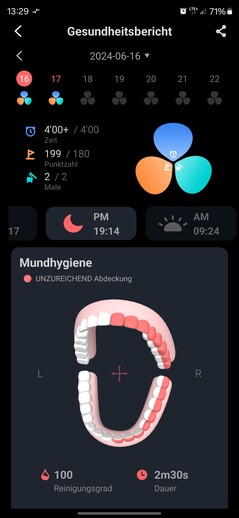Die X Pro Elite erinnert Nutzer alle 30 Sekunden an einen Wechsel des Putzbereiches und verfügt über eine 8-Zonen-Erkennung. Über das Farbdisplay wird dem Nutzer ein Feedback zum Putzergebnis nach Ablauf des Timers über das eingebaute Gyproskop dargestellt. Im Gegensatz zur X Ultra S erscheint uns die Quadrantenbewertung des Pro-Modells allerdings ungenauer respektive weniger vertrauenswürdig. Im Test erzielen wir stets über 97 Punkte, obwohl mutwillig Bereiche nicht gründlich geputzt worden sind.