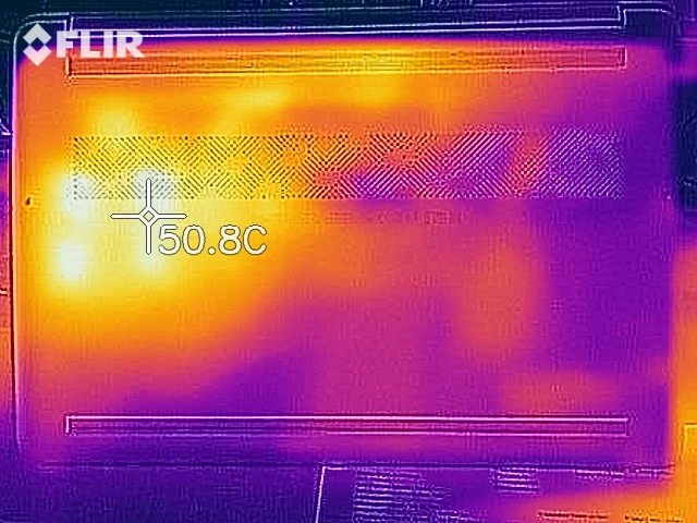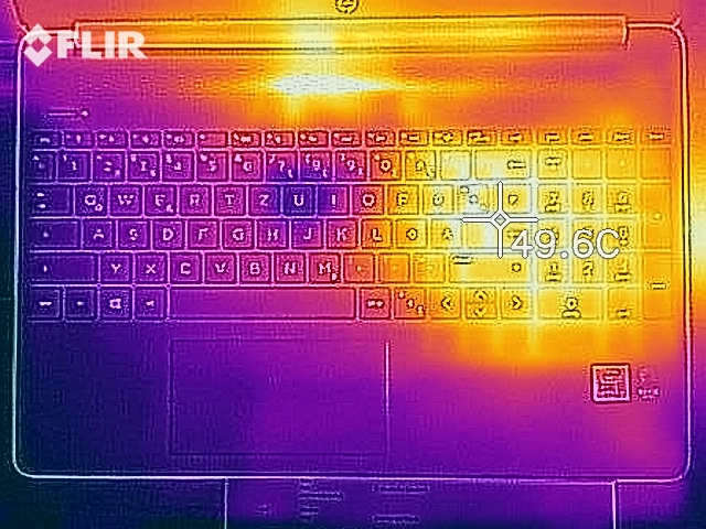 Wirklich heiß wird das Gerät an der Oberfläche zum Glück nie, maximal 40 Grad Celsius liegen an, am wärmsten wird aber die Unterseite, was auf den Oberschenkeln bei viel Last unangenehm werden kann. Die Handballenauflagen bleiben stets kühl, die rechte Tastaturseite wird etwas wärmer.