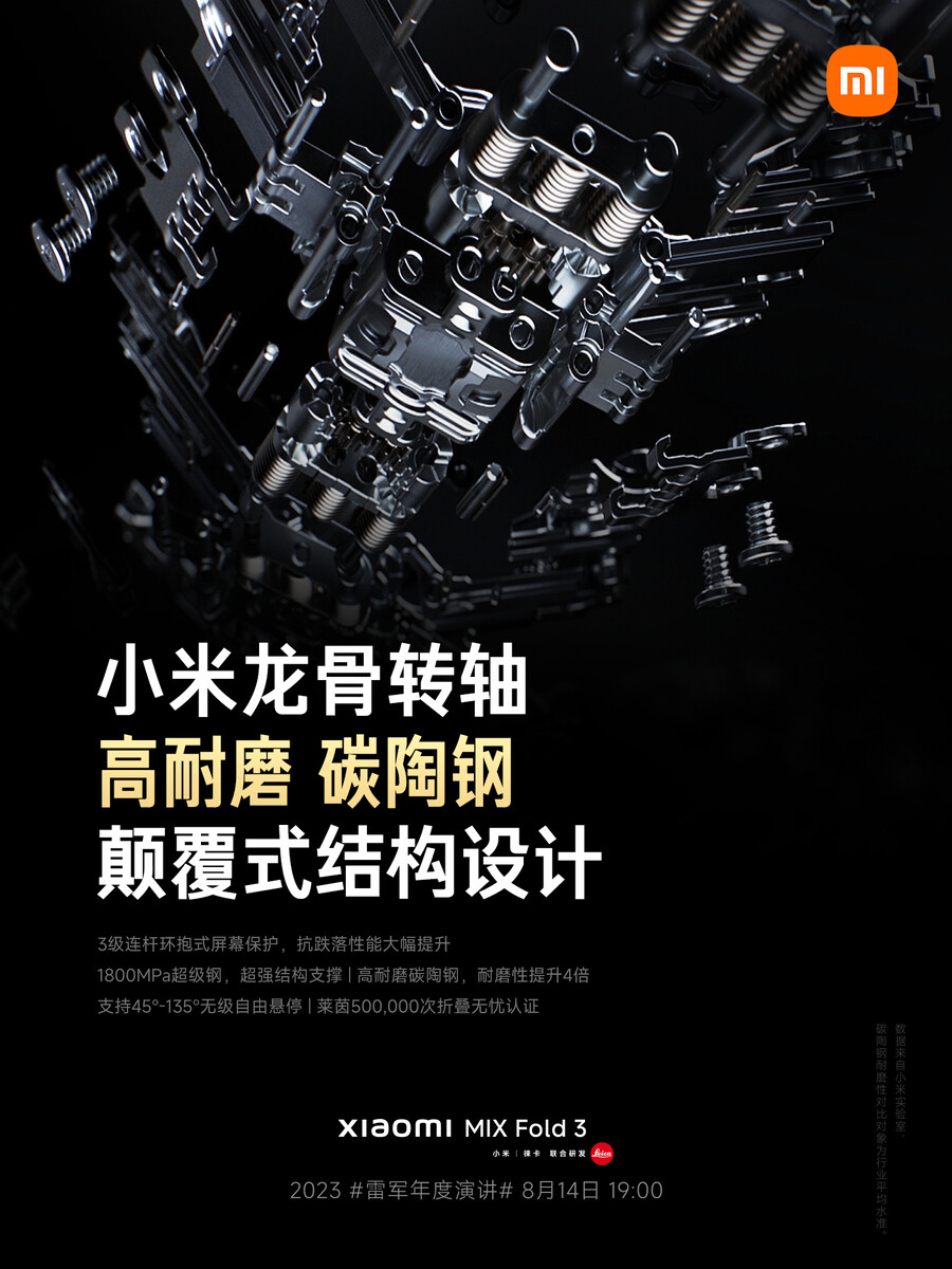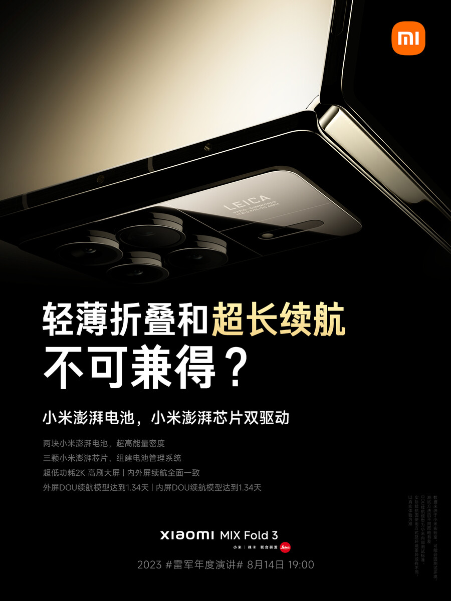 Das aus einer Karbon-Keramik-Stahlmischung bestehende Scharnier soll das flexible Innendisplay besonders gut bei Stürzen schützen und die Faltenbildung verhindern. Laut Hinweis des Analysten Ross Young (siehe unten) stammt das sehr helle AMOLED-Panel übrigens von Samsung und wird damit vermutlich auch auf ultradünnes Glas setzen. Ein weiteres Teaserplakat beschäftigt sich mit der Akkulaufzeit, die dank zweier Akkus und insgesamt drei Xiaomi Surge-Chips überdurchschnittlich gut ausfallen soll. Der Teaser erwähnt weiters eine QHD-Auflösung beim flexiblen Innendisplay, beide AMOLED-Panels sollen eine ähnlich gute Effizienz bieten. Im letzten Teaser oben lieferte Xiaomi dann noch weitere technische Daten wie Snapdragon 8 Gen 2, 50 Watt Wireless Charging, Stereolautsprecher sowie Angaben zu den sehr hellen E6-AMOLED-Panels mit jeweils maximal 2.600 nits Helligkeit.
