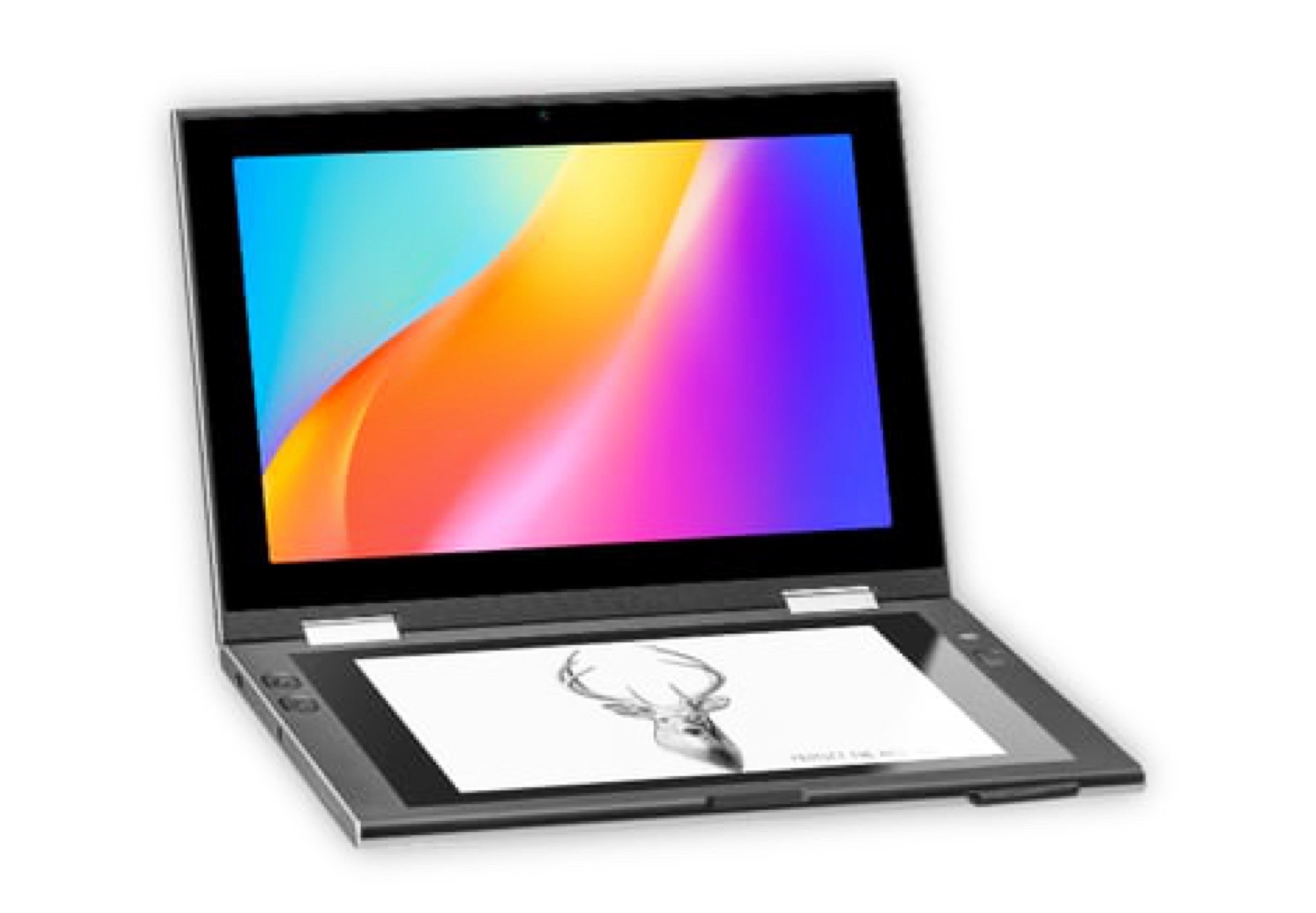 Das brandneue OkPad kombiniert zwei relativ kleine Displays zu einem kompakten Dual-Screen-Laptop, darunter ein 7,8 Zoll E-Ink-Display mit einer Auflösung von 1.872 x 1.404 Pixel. Dieses Panel kann zwar nur Graustufen darstellen, verbraucht dafür aber kaum Strom und bleibt auch bei direkter Sonneneinstrahlung einwandfrei lesbar.