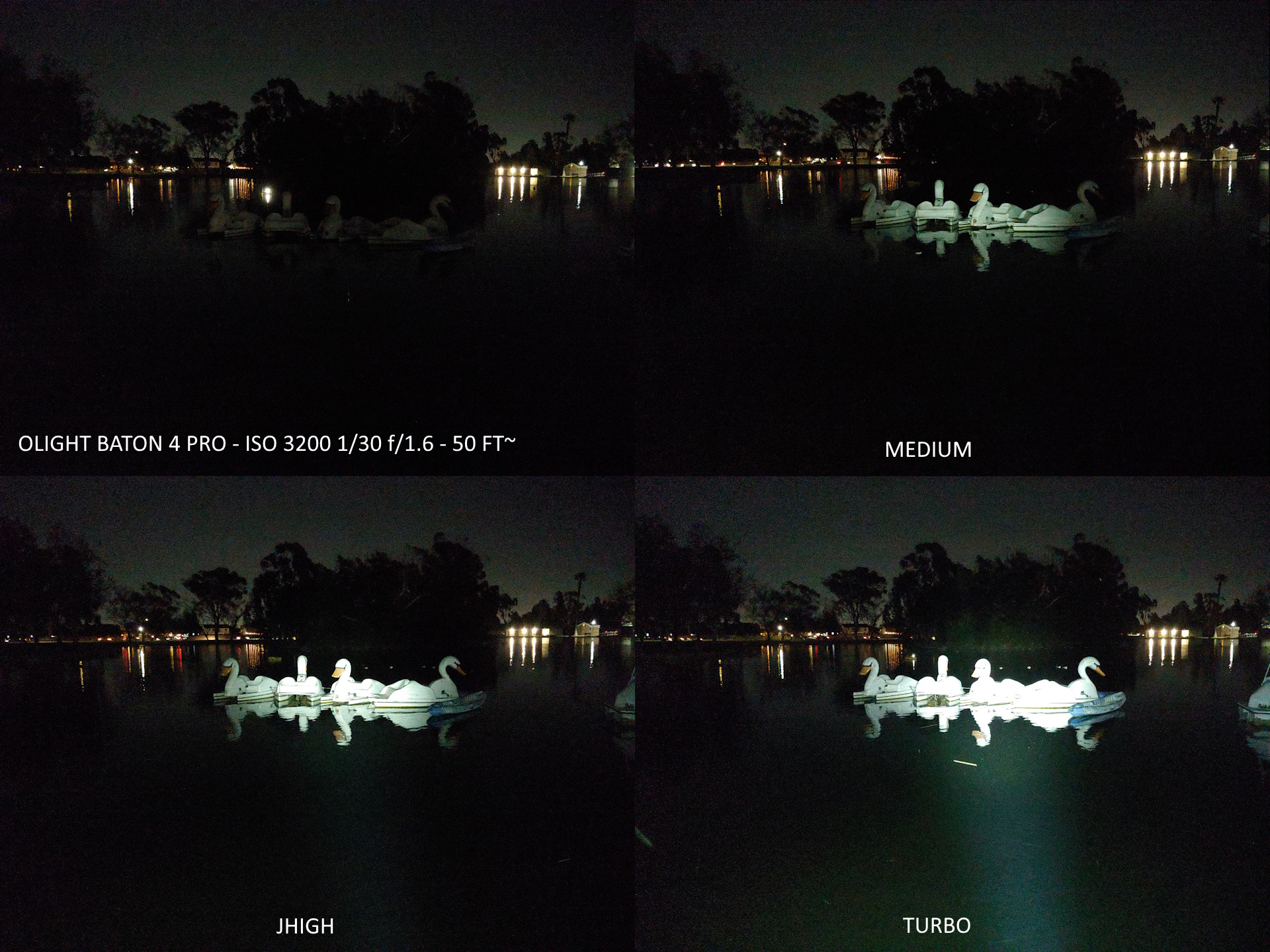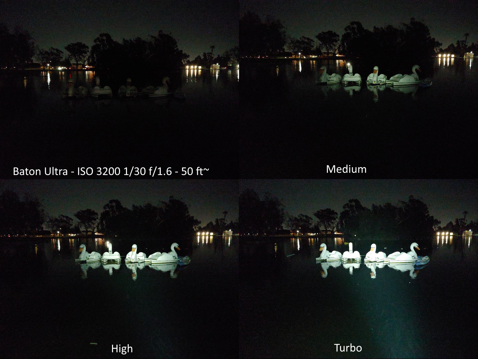 Die Batons wurden in ihren drei hellsten Modi getestet. Die Schwanenboote sind etwa 15 m (50 ft.) entfernt.