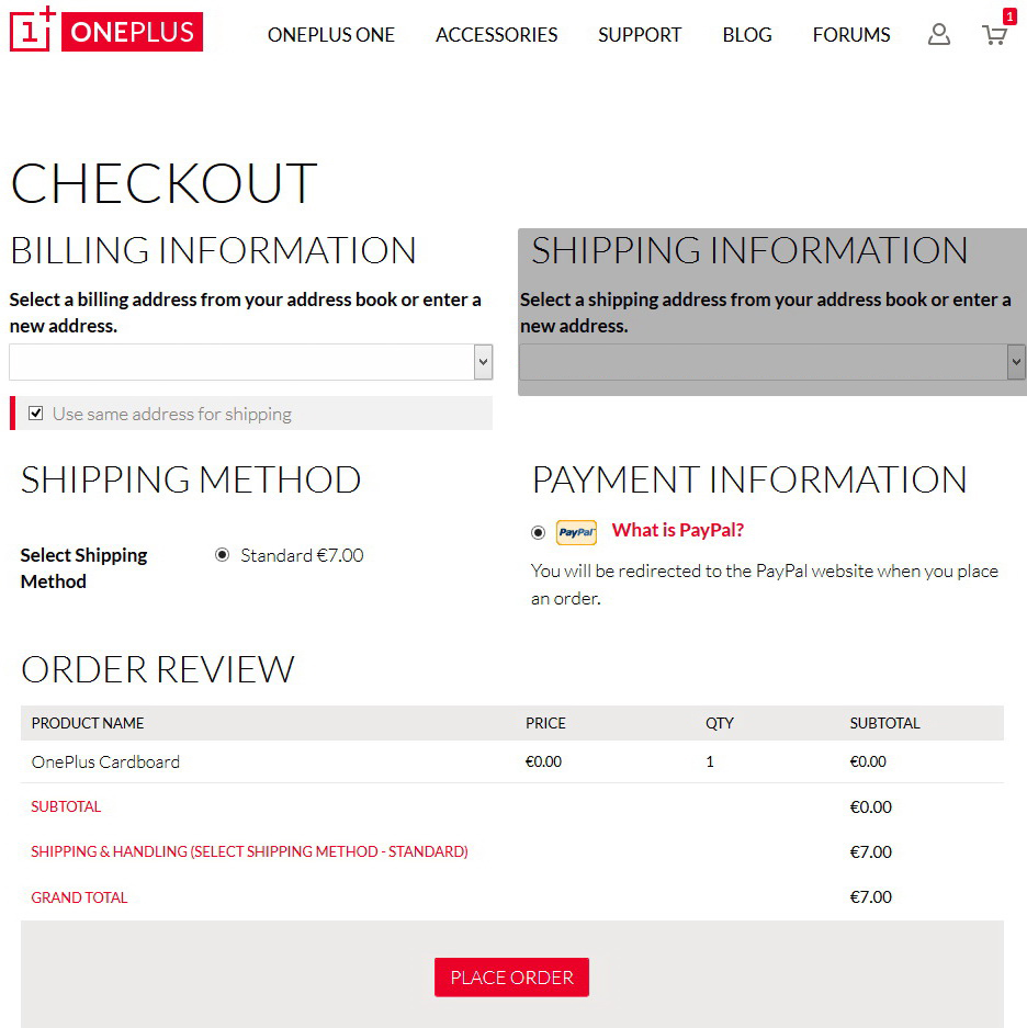 Das OnePlus Cardboard kann jetzt bestellt werden. Wir haben es vor ein paar Minuten selbst ausprobiert und im Onlineshop von OnePlus die "Virtual-Reality-Brille" im Stil des Google Cardboard für den Livestream zum Produktlaunch des neuen OnePlus 2 geordert. Der Bestellvorgang klappte reibungslos. Nach dem Hinzufügen in den Warenkorb ging es geradewegs zum Checkout.