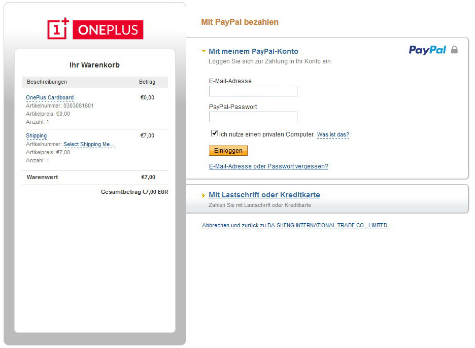 Als Empfänger für die Zahlung des OnePlus Cardboards (Artikelnummer 0303081601) erschien bei uns die Da Sheng International Trade Co. Ltd. Laut dem Infosystem des Webshops soll das Cardboard innerhalb von 4 Arbeitstagen bei uns eintreffen. Die danach eingetroffene "Order-Confirmation-Mail" bestätigte diesen Bearbeitungszeitraum.
