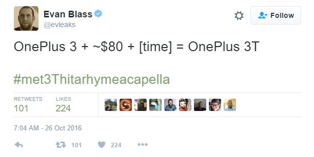 Das verstummte zwar die Gerüchteküche kurzzeitig, doch jetzt dreht sich das Gerüchtekarusell wieder: Irgendwas ist da im Busch. Ein neues OnePlus-Modell mit der Nummer A3010 tauchte bei der 3C-Zertifizierungsbehörde auf, wenige Tage danach wurde ein OnePlus-Designer dabei beobachtet, wie er auf der chinesischen Mikoblogging-Plattform Weibo von einem OnePlus 3T genannten Phone aus postete. Diesen Modellnamen bestätigte nun auch Leaker Evan Blass in einem Tweet: OnePlus 3 + ~ $80 + Time = OnePlus 3T. Der Preis für das Nachfolgemodell des OnePlus 3 dürfte somit um etwa 80 Euro anziehen.