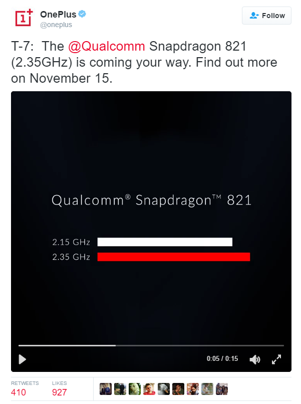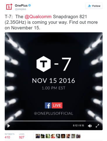 Gestern hat Qualcomm ein neues OnePlus-Modell mit Snapdragon 821-SOC angekündigt, heute folgte die Meldung von OnePlus selbst. Auf Twitter veröffentlichte das chinesische Unternehmen ein kurzes Video an dessen Ende ein T-7 für den 15. November angekündigt wird. T steht hierbei wohl für das OnePlus 3T und 7 ist aller Wahrscheinlichkeit nach ein Hinweis auf ein vorinstalliertes Android 7. Außerdem dürfte OnePlus den Launch live auf Facebook übertragen.