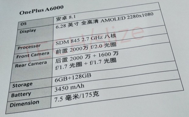 Datenblatt OnePlus 6 geleakt